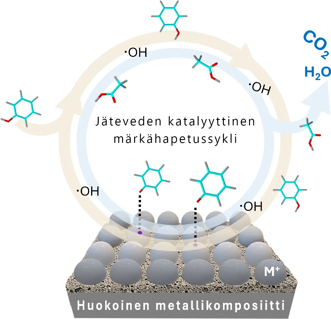 Kunnallis- ja teollisuusjätevedet sisältävät tutkitusti myrkyllisiä ei-biohajoavia yhdisteitä, kuten muoviteollisuuden raaka-aineita ja lääke- sekä huumausainejäämiä. Nämä luovat haasteita jäteveden puhdistukseen ja sen biologisiin prosesseihin. Kiertotalouden periaatteella väitöstyössä valmistettiin jäteveden esikäsittelyyn luonnonmukaisia, huokoisia mangaani- ja kuparikomposiitteja, joiden aktiivisuutta arvioitiin bisfenoli A:n (BPA) sekä lääkeainejäämien katalyyttisessä märkähapetuksessa. Kupari- sekä mangaanikomposiitin pinnalla BPA hajosi 98- ja 60-prosenttisesti. Katalyyttisessä märkähapetuksessa seurattiin myös lääkeainejäämien ei-biohajoavien yhdisteiden biohajoavuutta. Mangaani- sekä kuparikomposiitilla biohajoavuus kasvoi peräti 65 ja 80 prosenttia. Metallikomposiitit ovat ekologinen edullinen vaihtoehto nykyisille katalyyttimateriaalien valmistajille ja jätevesipuhdistuksen toimijoille.