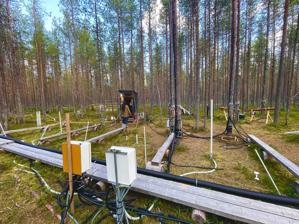 Laitteita ja antureita asennettiin viime kesänä mäntyihin tutkimusaloille Oulangalla. Aloille tehdään eri paksuisia lumikerroksia 25 cm:stä jopa yli metrin kinokseen vertailuja varten. Kuva Oulun yliopisto