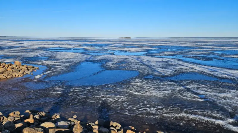 Kuva: Lappajärven vedenpinta on poikkeuksellisen matalalla. Lappajärven Lehtiniemessä jäät ovat vielä paikoillaan, vaikka järvi on jo pääosin jäätön.