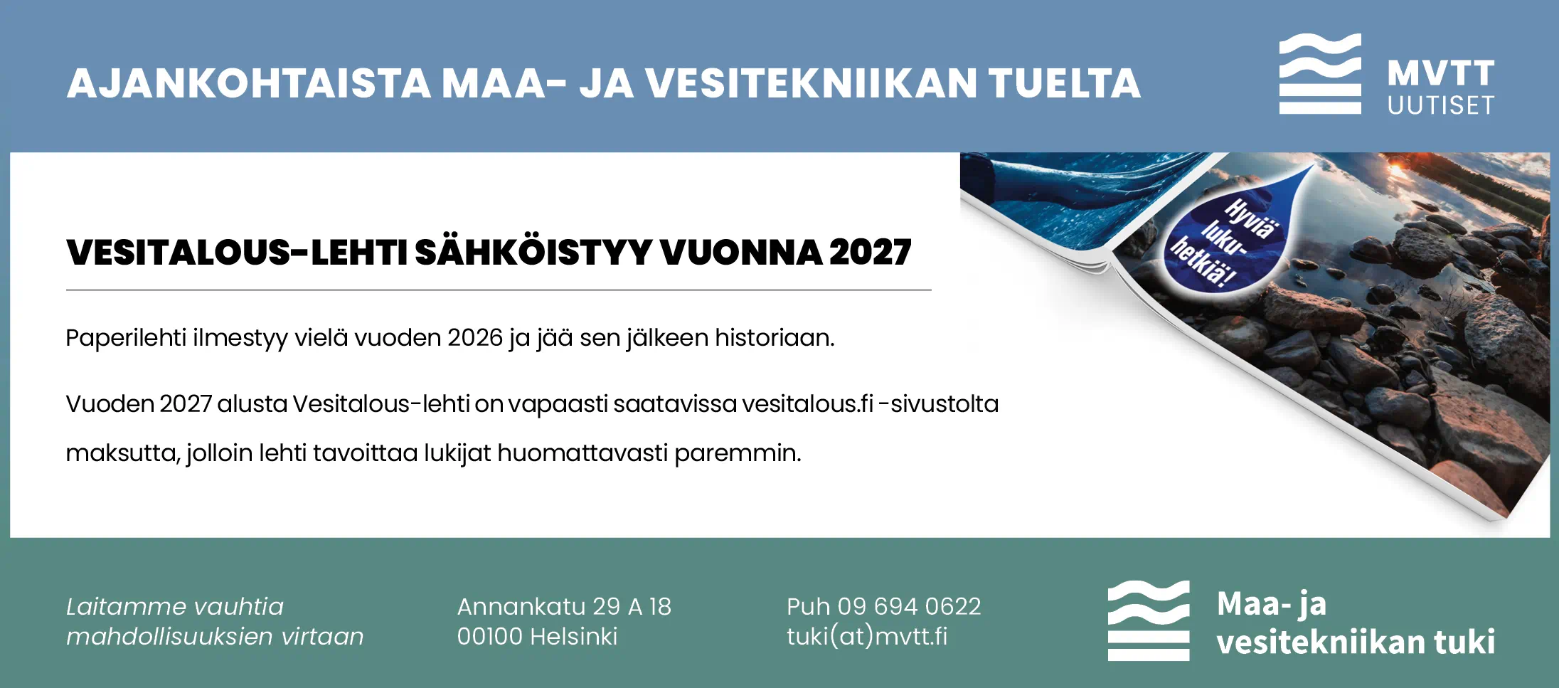 Vesitalous-lehti sähköisTYY vuonna 2027Paperilehti ilmestyy vielä vuoden 2026 ja jää sen jälkeen historiaan. Vuoden 2027 alusta Vesitalous-lehti on vapaasti saatavissa vesitalous.fi -sivustolta maksutta, jolloin lehti tavoittaa lukijat huomattavasti paremmin.