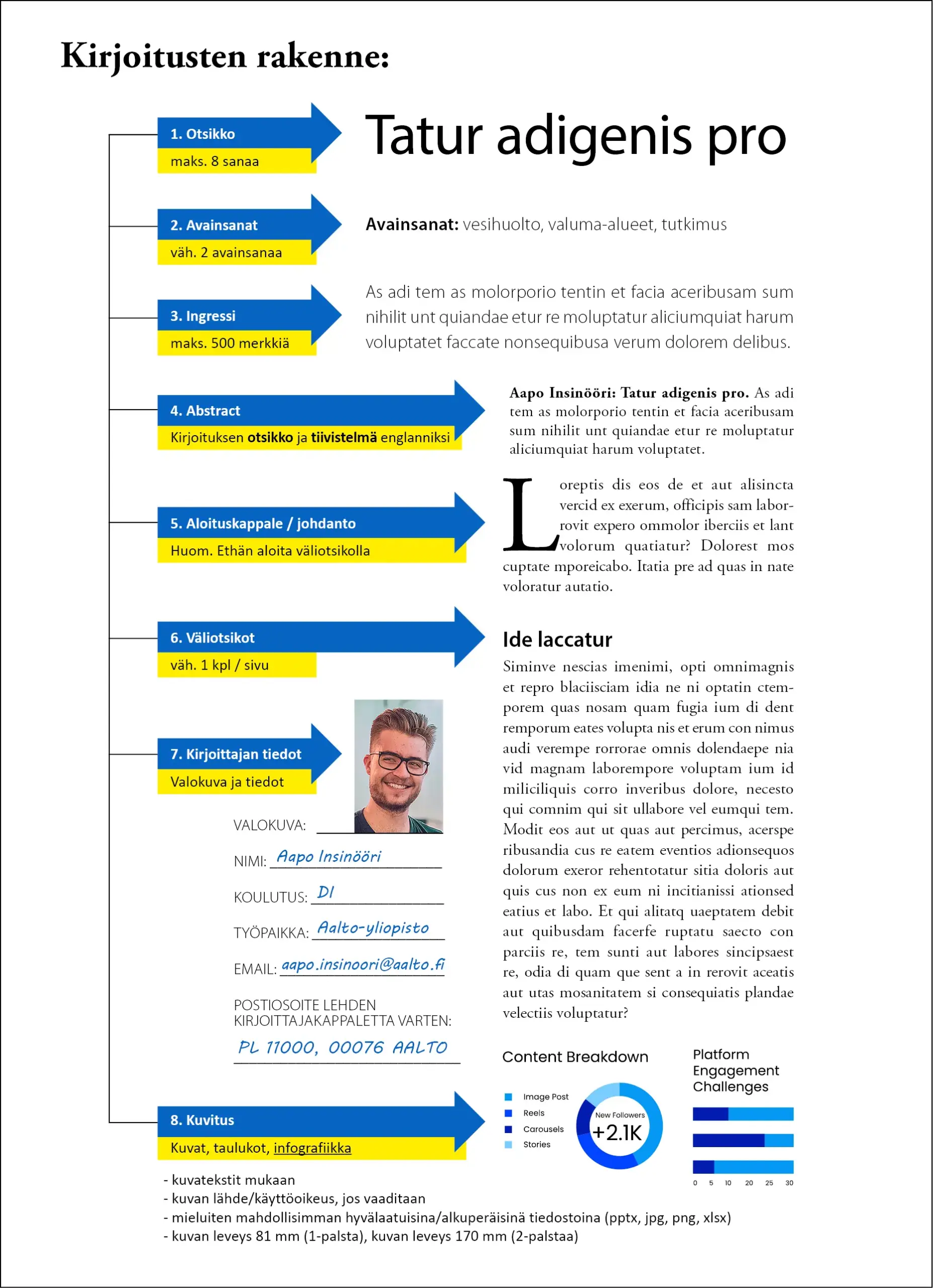 7. Kirjoittajan valokuva ja yhteystiedot (1. kirjoittajan valokuva, 2. Nimi, 3. Koulutus, 4. Työpaikka, 5. Sähköpostiosoite sekä 6. Postiosoite lehden kirjoittajakappaletta varten). Kirjoittajan valokuvan yhteydessä kerrotaan lyhyesti kirjoittajan yhteystiedot ja työhistoriaa tai muuta artikkelin kannalta olennaista tietoa, pituus noin 100 merkkiä. Huom. Jos haluat lehden kirjoittajakappaleen, muista ilmoittaa myös postiosoiteesi!